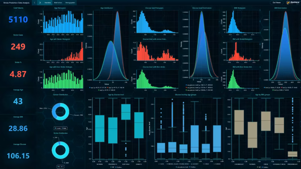 The Stroke Prediction Data Analysis Dashboard with Dashtera demonstrates how no-code visual analytics can transform raw health data into actionable insights. With three focused dashboard pages—Overview, Risk Factors, and Demographics—the system supports: