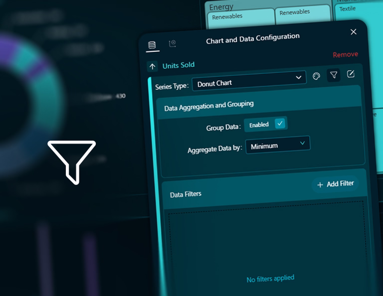 In Dashtera, users can enable grouping and aggregation from the Chart and Data configuration dialog. Once enabled, the data is automatically grouped and aggregated based on the selected aggregation method.