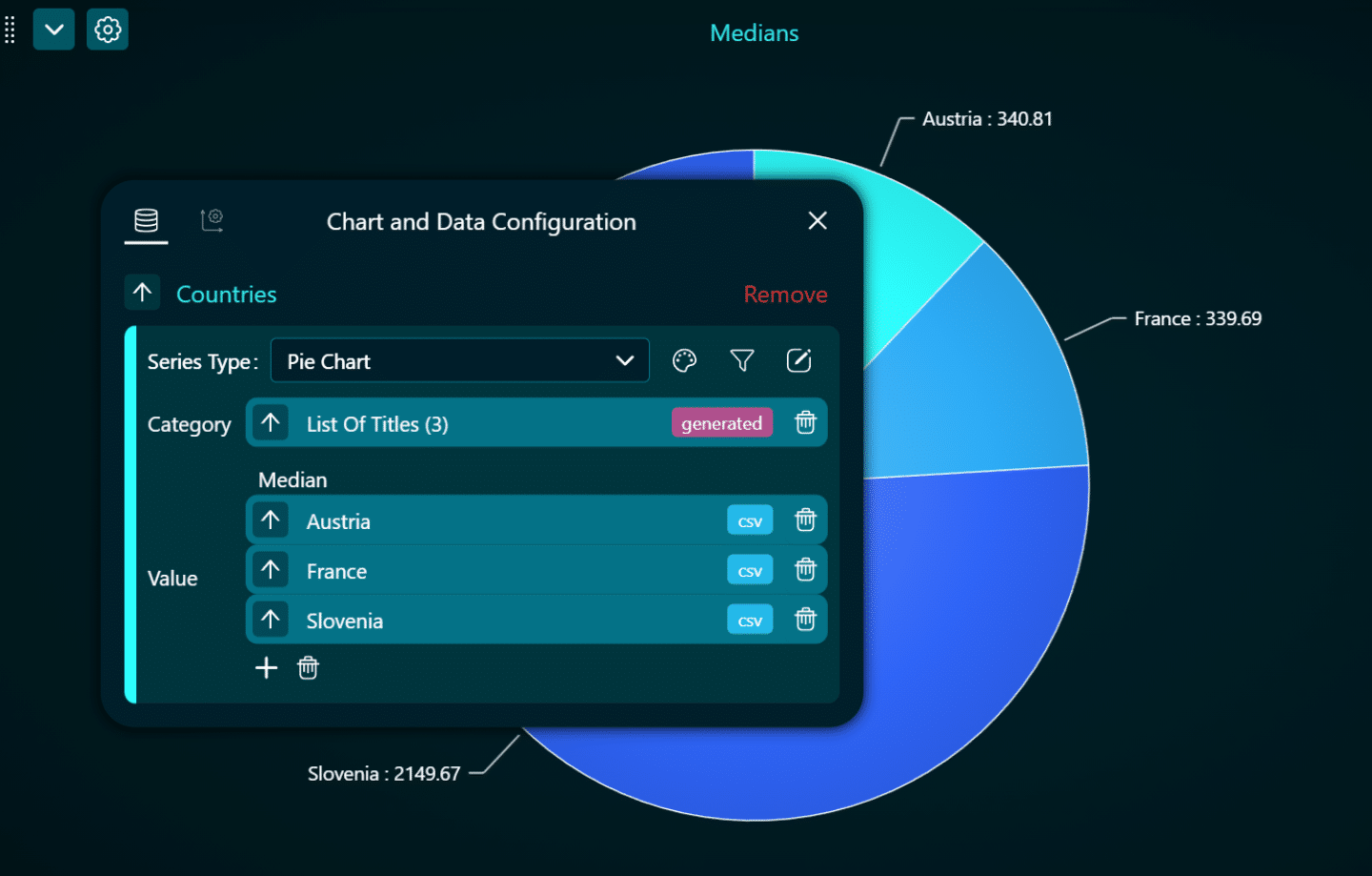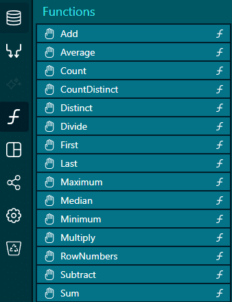 The Functions, found from the toolbar on the left, help to process data values, before they enter the charts to be visualized.