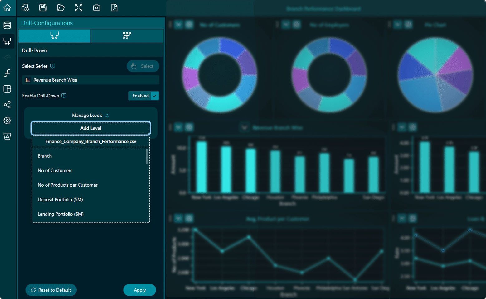Dashtera is built to visualize large-scale datasets with high performance. Create smooth and responsive line charts, area charts, and heatmaps that can handle millions of data points. You can also build simple visualizations — like pie charts, bar graphs, and donut charts — with intuitive drill-down interactions that reveal more with a click.