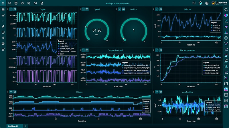 Telemetry often comes in high-frequency bursts — Dashtera’s GPU-accelerated rendering engine can handle millions of data points in real-time. With support for line charts, heatmaps, gauges, and 3D charts, you can map every parameter from engine performance to remote IoT metrics in a format that’s easy to interpret and act on.